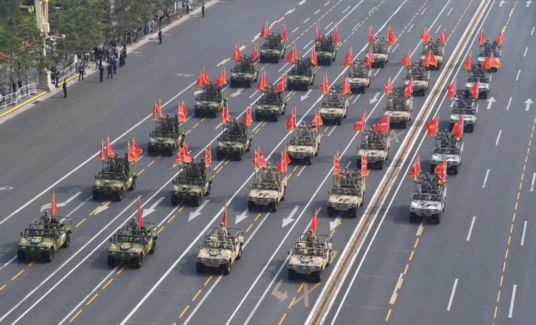 阅兵分列式上,25辆猛士战车载着100面荣誉战旗,缓缓驶过天安门。