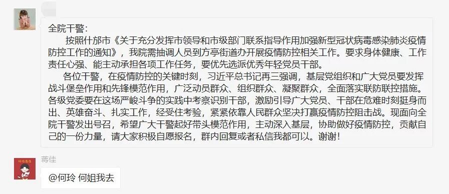 1月28日,正月初四,什邡市疫情联防联控机制指挥部下发紧急通知,要求各市级部门安排人员协助镇、街道开展疫情防控工作。什邡法院积极响应,发出通知号召干警主动投身防疫一线。