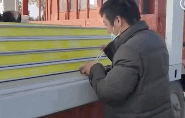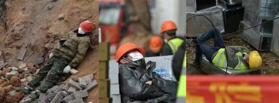 △河南驻马店的刘海龙师傅,今年没有回家,自愿到工地来支援!他说自己虽是白班,但工地上没有具体上班和下班的时间,有事情就要去做。“我今天的任务是看护这个修路用的定位旗,不能让人碰倒。我在这里没有认识的人,我是自愿过来的”