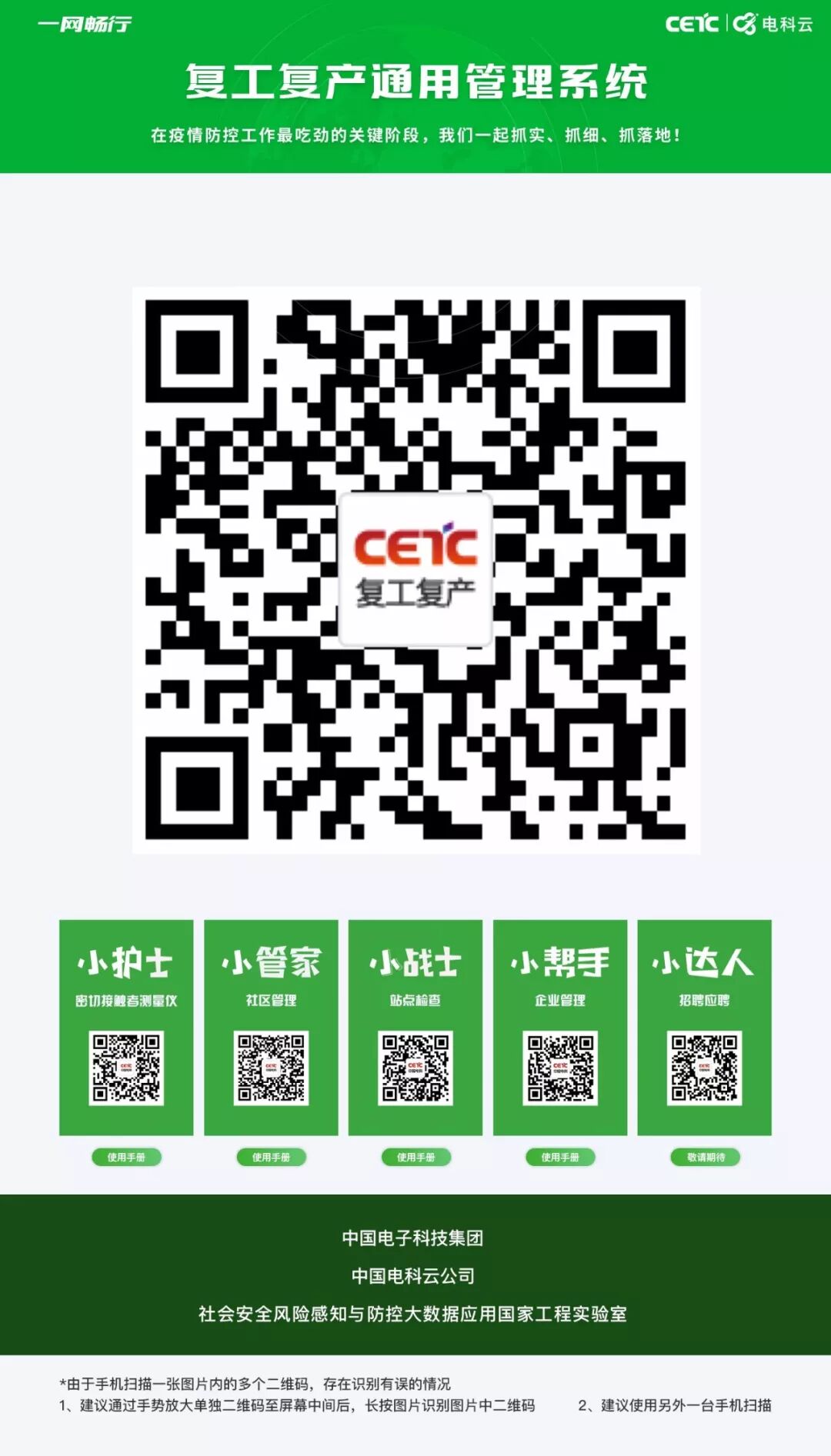 2月20日,中国电科正式发布“一网畅行——复工复产通用管理系统”,并面向公众开放使用。该系统由一个风险人群感知大数据中心、一个智能指挥平台、五个APP应用组成(1+1+5),具有数据权威、精准评估、体系联动、有效管控四大特点。各级政府及企事业单位可通过互联网扫码下载,既可单独使用,又可组合成管理体系,进而实现精确管控。