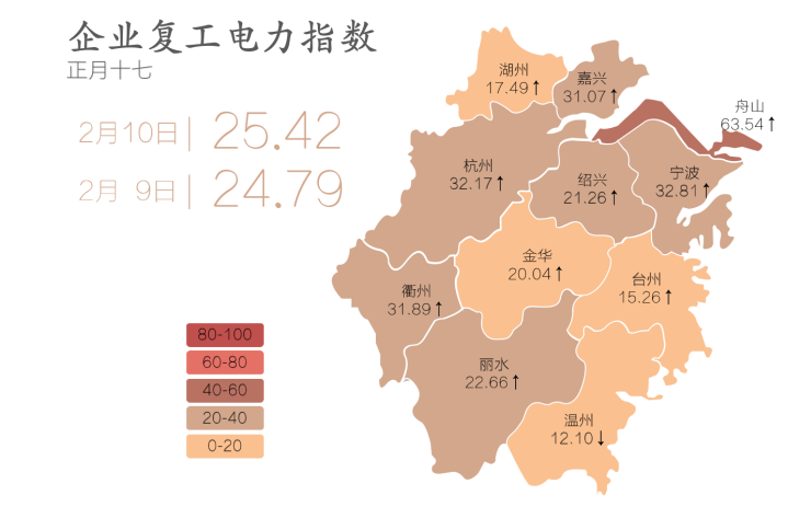 国网浙江电力全力推行电力大数据服务,运用营销系统海量数据,建立算法,分析全省企业复工情况,根据企业历史用电量情况、当日用电量情况等数据,精准对各个企业进行“画像”,得出复工指数,动态监测、直观反映当前企业的复工复产情况,解决繁琐的逐级上报和疫情防控人手不足等难点,协助政府做好疫情防控及有序复工工作。该“企业复工电力指数”的推出尚属国内首个。