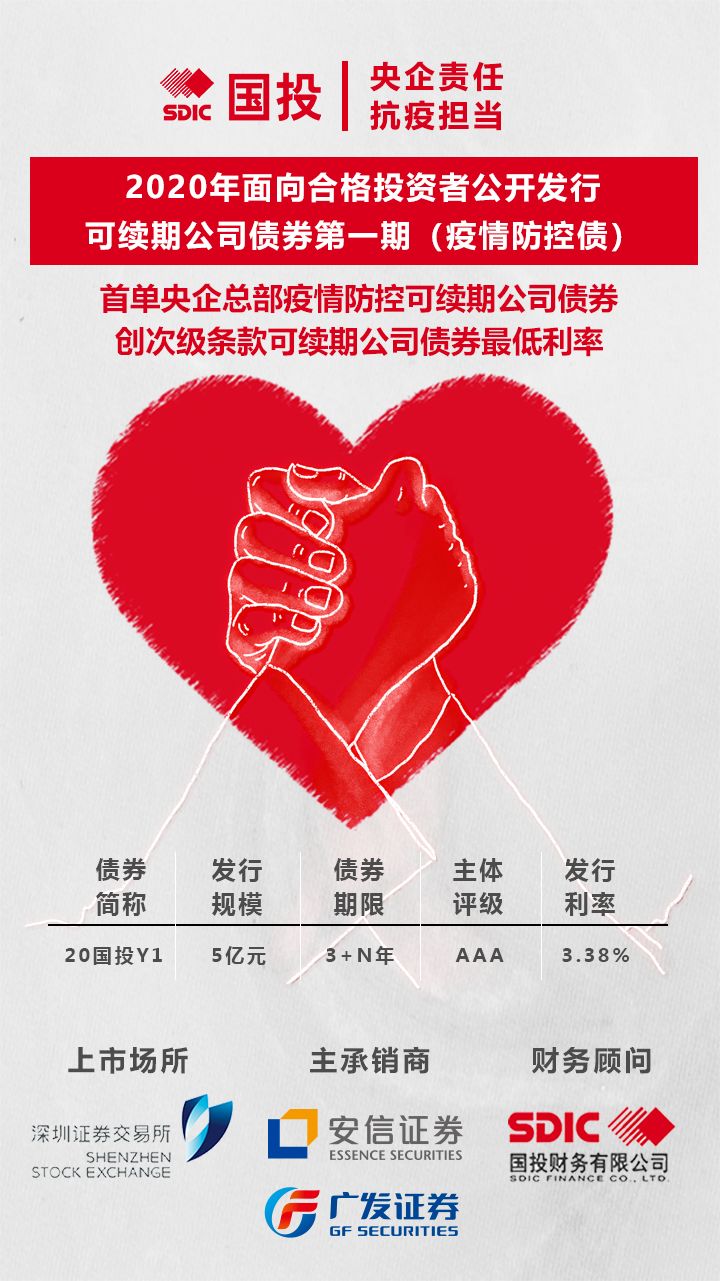 2020年2月18日,国家开发投资集团有限公司于深交所成功发行国内资本市场首单央企总部疫情防控可续期公司债券,发行规模5亿元,发行利率3.38%,期限3+N年,募集资金将优先用于支持防疫相关成员企业开展防疫物资生产活动。