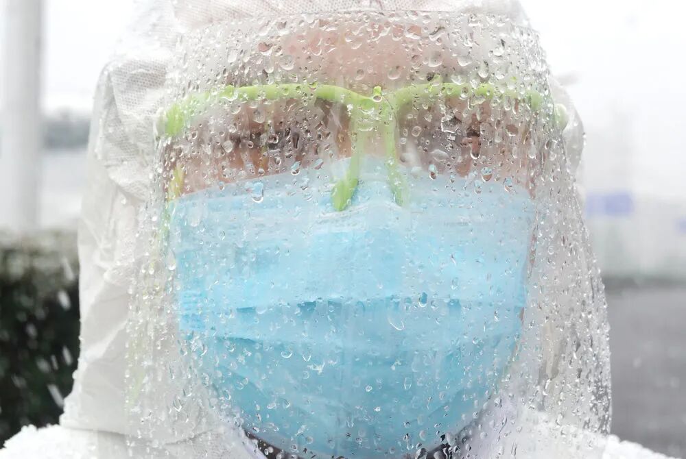 在武汉客厅方舱医院,武汉市公安局东西湖区交通大队快骑队警务人员在现场执勤。由于雨雪天气,护目镜上满是雾水(2月15日摄)。新华社记者 才扬 摄