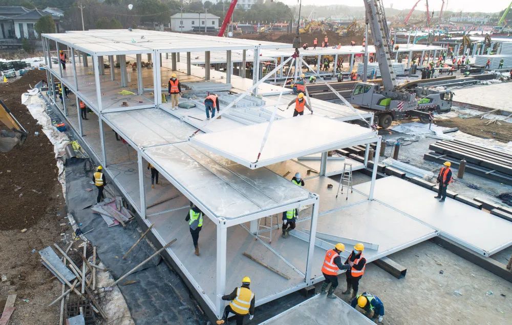 在武汉火神山医院建设工地,来自中建三局的工人在加紧施工(1月28日摄,无人机照片)。新华社记者 肖艺九 摄