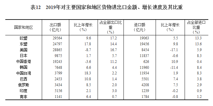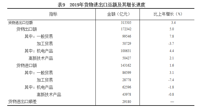 对外贸易稳中提质。贸易规模再创新高。2019年我国货物进出口总额31.6万亿元,比上年增长3.4%,连续两年超过30万亿元,有望蝉联世界第一。贸易结构继续优化。2019年一般贸易进出口占货物进出口总额比重达59.0%,比上年提高1.2个百分点。服务贸易规模稳步扩张。2019年服务进出口总额比上年增长2.8%,服务贸易逆差收窄10.5%。其中,服务出口总额在服务进出口总额中的比重达36.1%,比上年提高2.0个百分点。