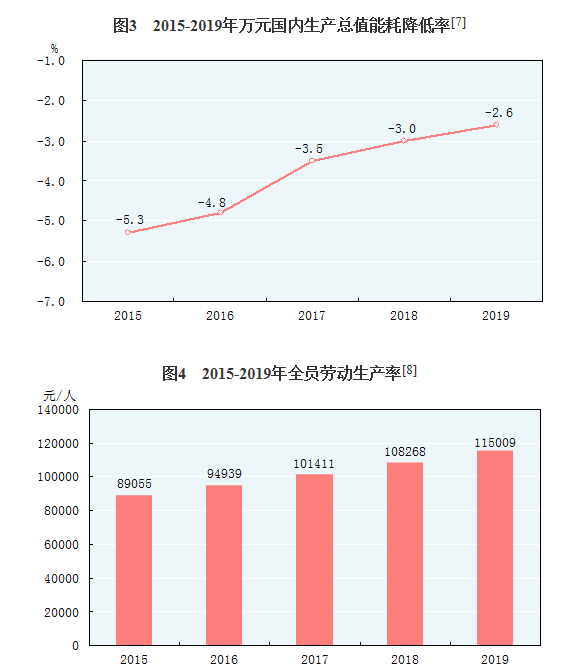 资源利用效率不断提升。节能降耗减排成效显现。2019年全国万元国内生产总值能耗比上年下降2.6%,万元国内生产总值二氧化碳排放下降4.1%,万元国内生产总值用水量下降6.1%。清洁能源使用更加广泛。2019年煤炭消费量占能源消费总量的57.7%,比上年下降1.5个百分点;天然气、水电、核电、风电等清洁能源消费量占能源消费总量的23.4%,提高1.3个百分点。