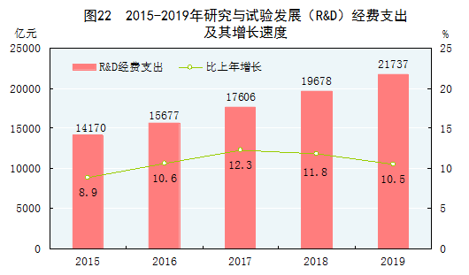 全年研究与试验发展(R&D)经费支出21737亿元,比上年增长10.5%,与国内生产总值之比为2.19%,其中基础研究经费1209亿元。国家科技重大专项共安排234个课题,国家自然科学基金共资助45192个项目。截至年底,正在运行的国家重点实验室515个,累计建设国家工程研究中心133个,国家工程实验室217个,国家企业技术中心1540家。国家科技成果转化引导基金累计设立21支子基金,资金总规模313亿元。国家级科技企业孵化器1177家,国家备案众创空间1888家。全年境内外专利申请438.0万件,比上年增长1.3%;授予专利权259.2万件,增长5.9%;PCT专利申请受理量为6.1万件。截至年底,有效专利972.2万件,其中境内有效发明专利186.2万件,每万人口发明专利拥有量13.3件。全年商标申请783.7万件,比上年增长6.3%;商标注册640.6万件,增长27.9%。全年共签订技术合同48.4万项,技术合同成交金额22398亿元,比上年增长26.6%。