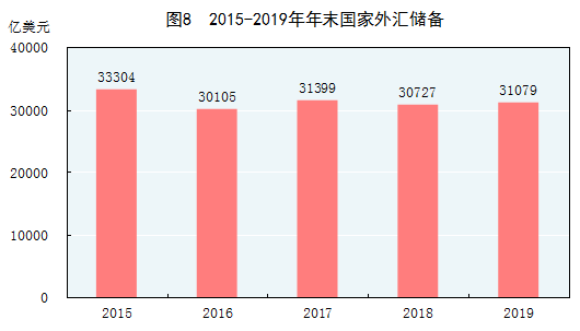 年末国家外汇储备31079亿美元,比上年末增加352亿美元。全年人民币平均汇率为1美元兑6.8985元人民币,比上年贬值4.1%。