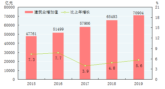 全年全社会建筑业增加值70904亿元,比上年增长5.6%。全国具有资质等级的总承包和专业承包建筑业企业利润8381亿元,比上年增长5.1%,其中国有控股企业2585亿元,增长14.5%。