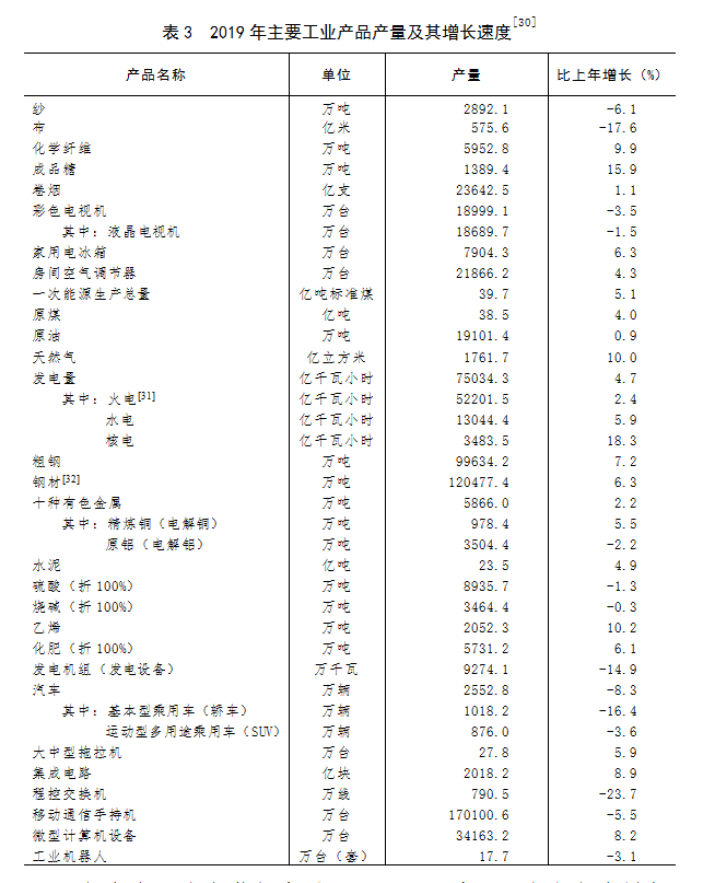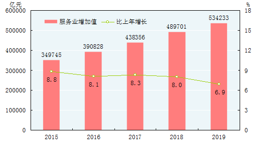 产业发展水平继续提升。农业基础地位得到加强。2019年第一产业增加值70467亿元,比上年增长3.1%。粮食总产量66384万吨,创历史新高。2019年新增耕地灌溉面积27万公顷,新增高效节水灌溉面积146万公顷。工业持续发展。2019年工业增加值317109亿元,比上年增长5.7%,其中制造业增加值有望连续10年位居世界第一。主要产品产量稳居世界前列。2019年,集成电路产量2018亿块,增长8.9%;钢材产量12亿吨,增长6.3%。2019年末,全国发电装机容量201066万千瓦,比上年末增长5.8%。服务业增势较好。2019年服务业增加值534233亿元,比上年增长6.9%,其中信息传输、软件和信息技术服务业增长18.7%,租赁和商务服务业增长8.7%。