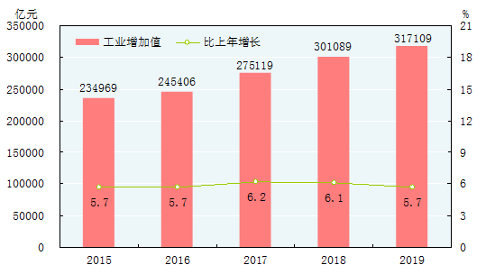 全年全部工业增加值317109亿元,比上年增长5.7%。规模以上工业增加值增长5.7%。在规模以上工业中,分经济类型看,国有控股企业增加值增长4.8%;股份制企业增长6.8%,外商及港澳台商投资企业增长2.0%;私营企业增长7.7%。分门类看,采矿业增长5.0%,制造业增长6.0%,电力、热力、燃气及水生产和供应业增长7.0%。