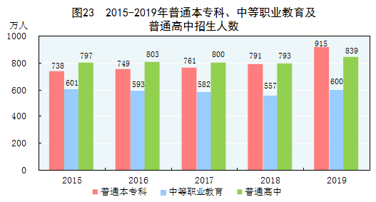 全年研究生教育招生91.7万人,在学研究生286.4万人,毕业生64.0万人。普通本专科招生914.9万人,在校生3031.5万人,毕业生758.5万人。中等职业教育招生600.4万人,在校生1576.5万人,毕业生493.4万人。普通高中招生839.5万人,在校生2414.3万人,毕业生789.2万人。初中招生1638.8万人,在校生4827.1万人,毕业生1454.1万人。普通小学招生1869.0万人,在校生10561.2万人,毕业生1647.9万人。特殊教育招生14.4万人,在校生79.5万人,毕业生9.8万人。学前教育在园幼儿4713.9万人。九年义务教育巩固率为94.8%,高中阶段毛入学率为89.5%。
