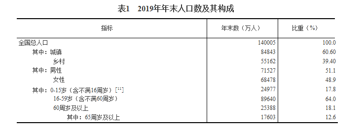 年末全国大陆总人口140005万人,比上年末增加467万人,其中城镇常住人口84843万人,占总人口比重(常住人口城镇化率)为60.60%,比上年末提高1.02个百分点。户籍人口城镇化率为44.38%,比上年末提高1.01个百分点。全年出生人口1465万人,出生率为10.48‰;死亡人口998万人,死亡率为7.14‰;自然增长率为3.34‰。全国人户分离的人口2.80亿人,其中流动人口2.36亿人。