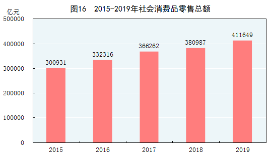 内需结构持续改善。在国际环境复杂、外部需求波动的情况下,内需特别是消费对于稳定经济运行的压舱石作用明显。2019年内需对经济增长贡献率为89.0%,其中最终消费支出贡献率为57.8%,比资本形成总额高26.6个百分点。社会消费品零售总额达411649亿元,比上年增长8.0%,规模首次突破40万亿元。弱项短板领域投资得到加强。2019年高技术产业和社会领域投资分别比上年增长17.3%和13.2%,