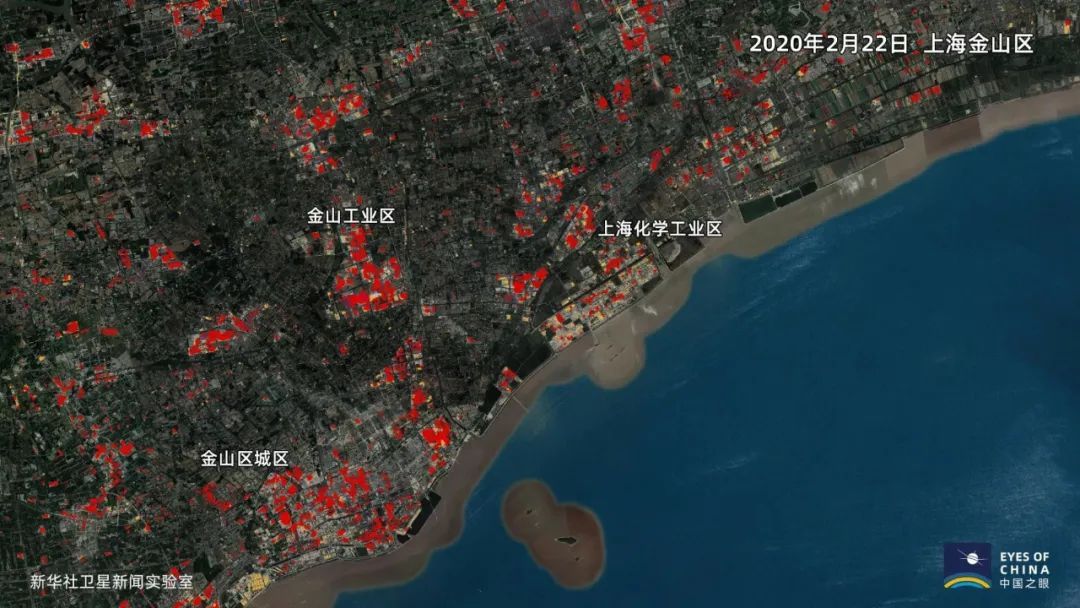 上图显示,复工产生的工业热能和人口密度增加带来的热值提升,使上海市金山区“红”了起来。