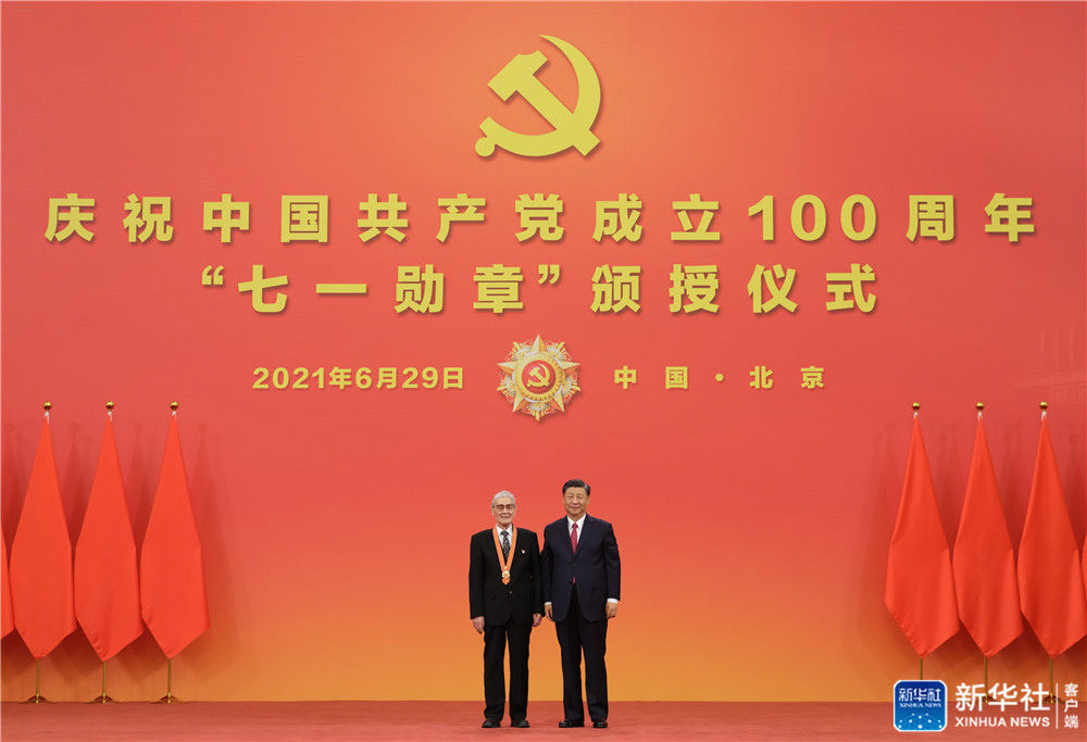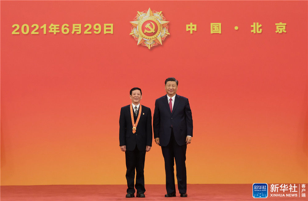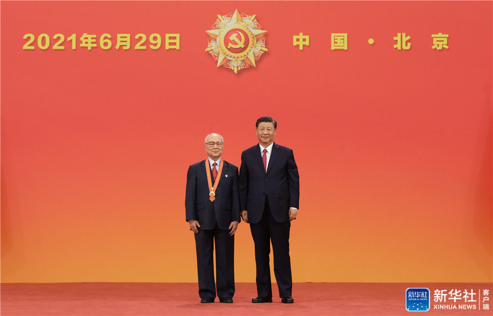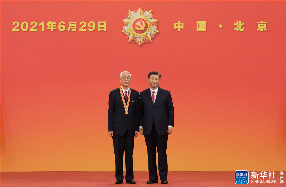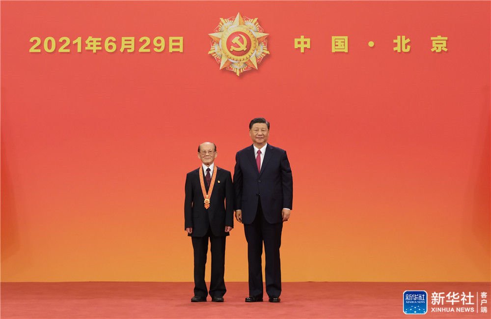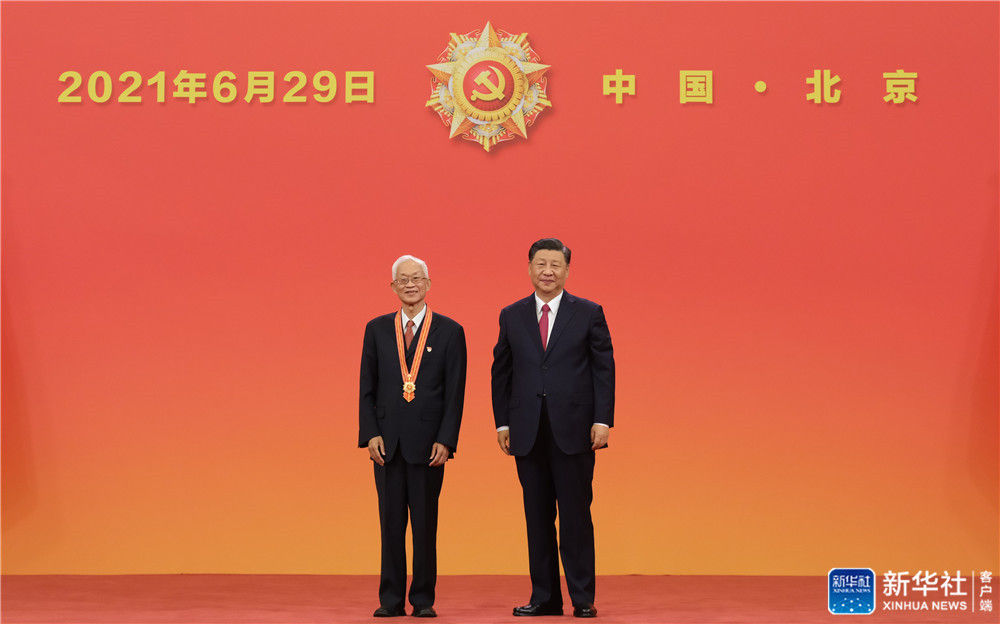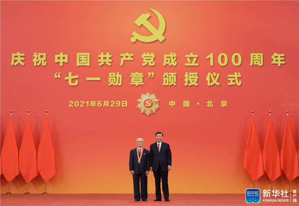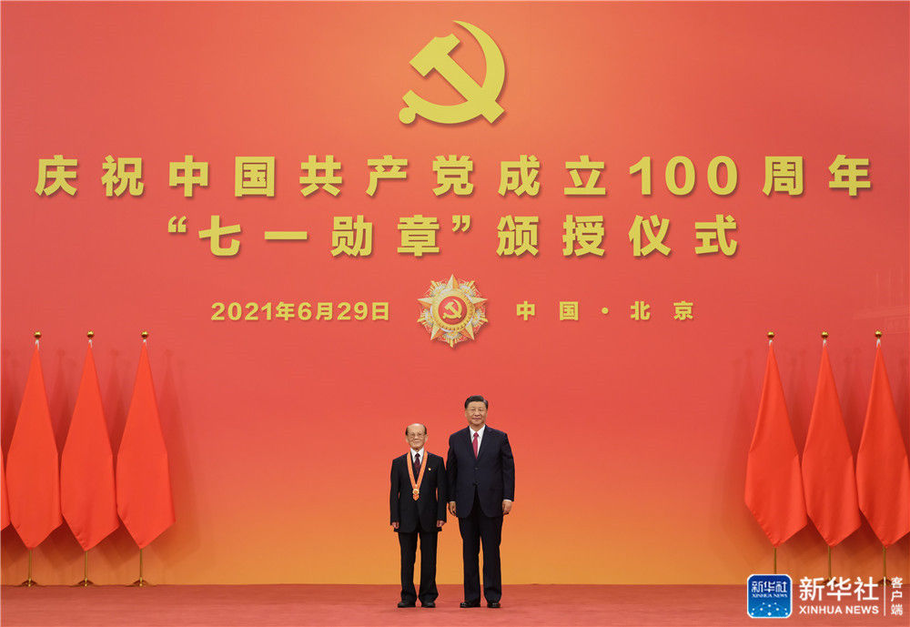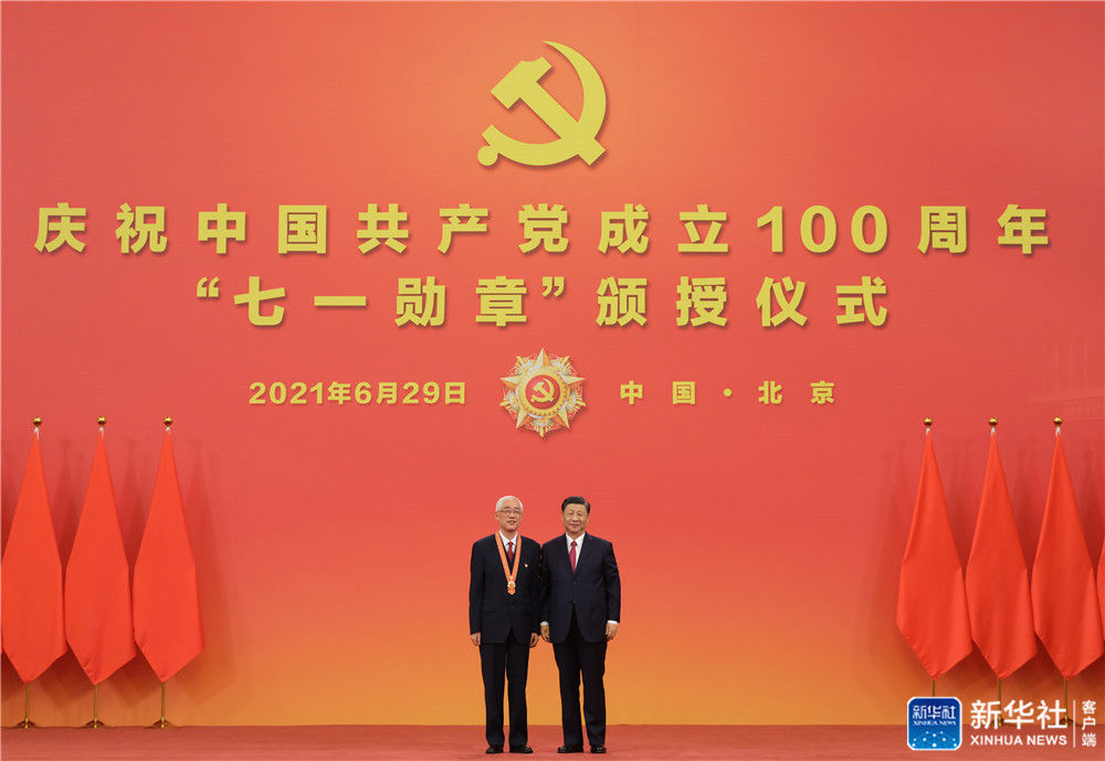 6月29日,庆祝中国共产党成立100周年“七一勋章”颁授仪式在北京人民大会堂金色大厅隆重举行。中共中央总书记、国家主席、中央军委主席习近平向“七一勋章”获得者周永开颁授勋章。新华社记者 李学仁