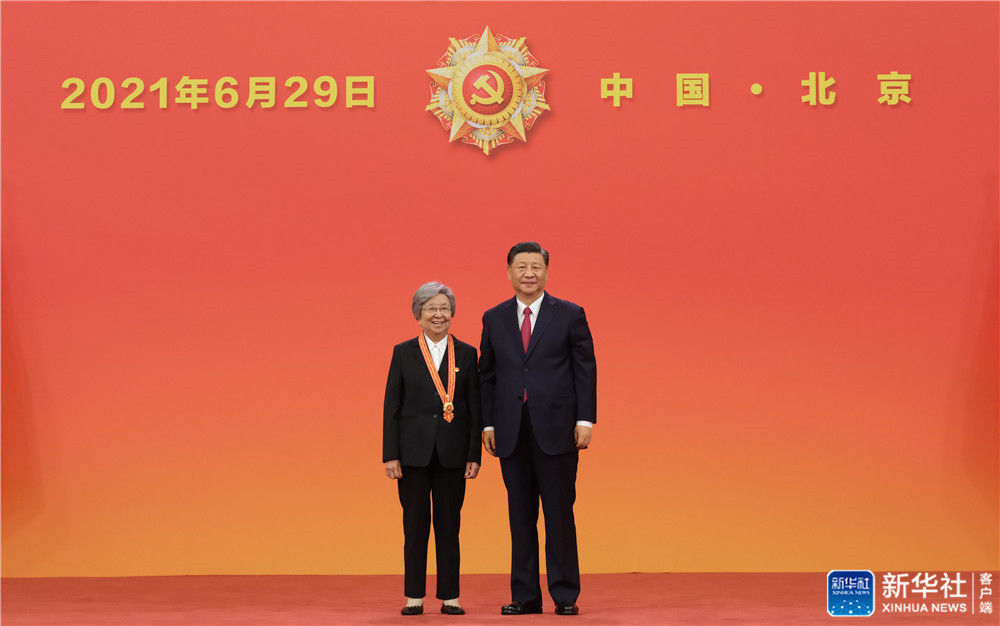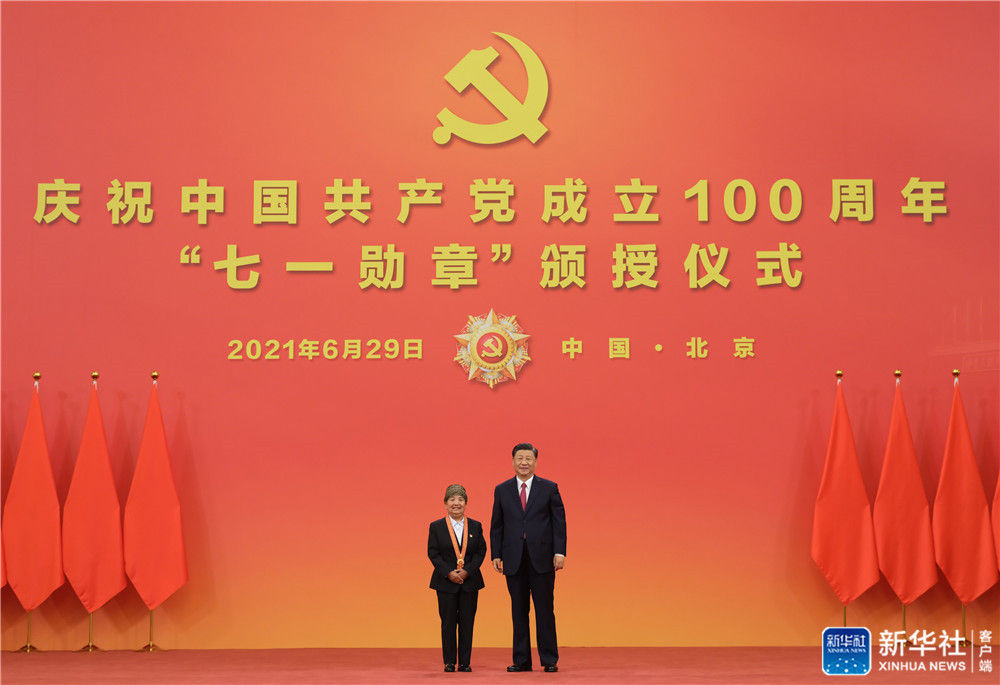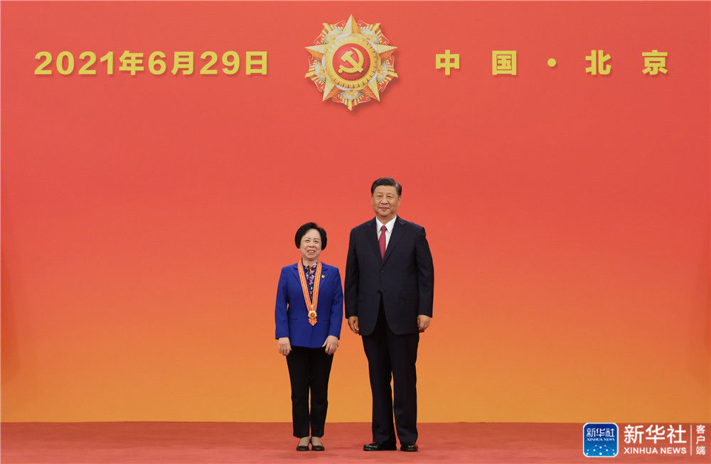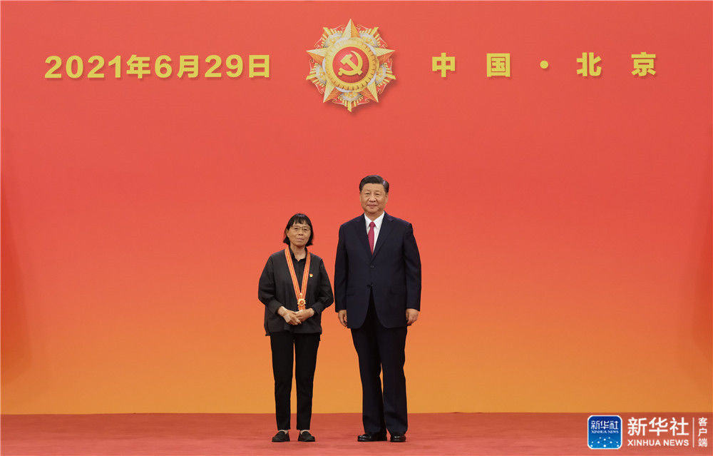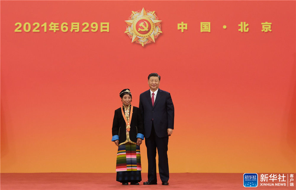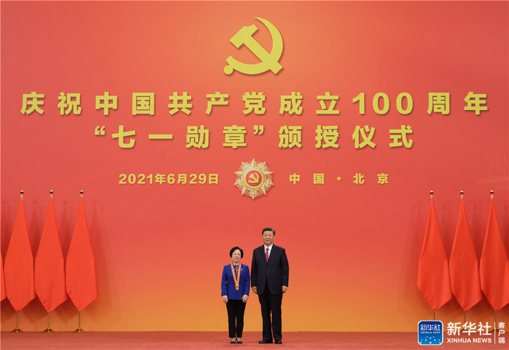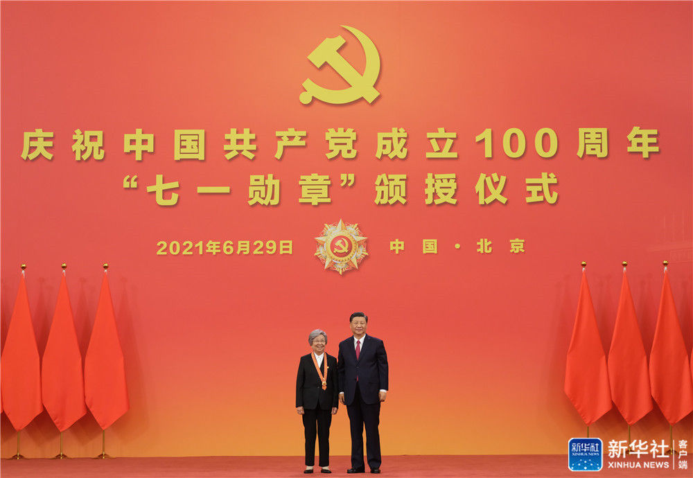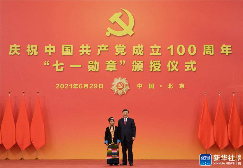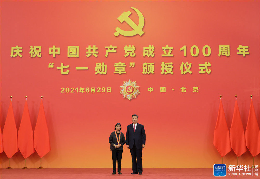 6月29日,庆祝中国共产党成立100周年“七一勋章”颁授仪式在北京人民大会堂金色大厅隆重举行。中共中央总书记、国家主席、中央军委主席习近平向“七一勋章”获得者马毛姐颁授勋章。新华社记者 李学仁 摄