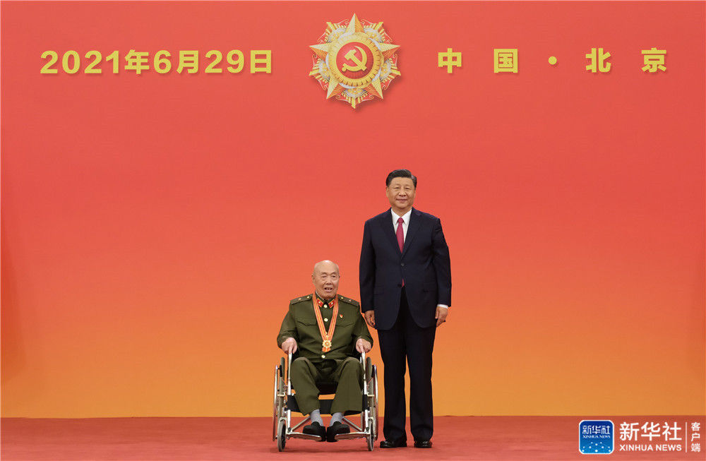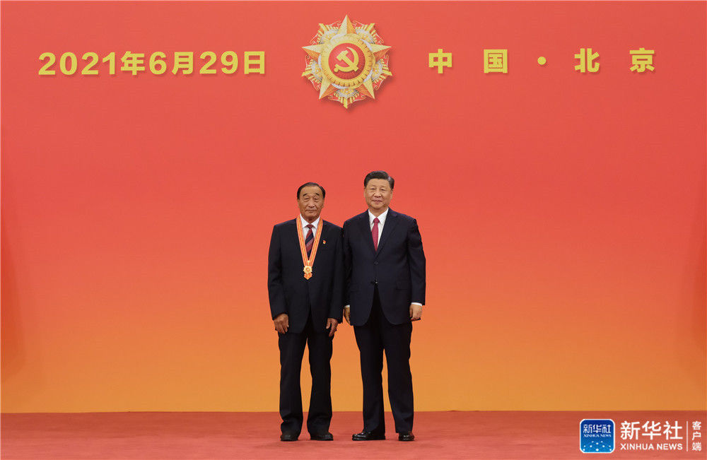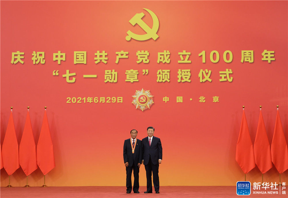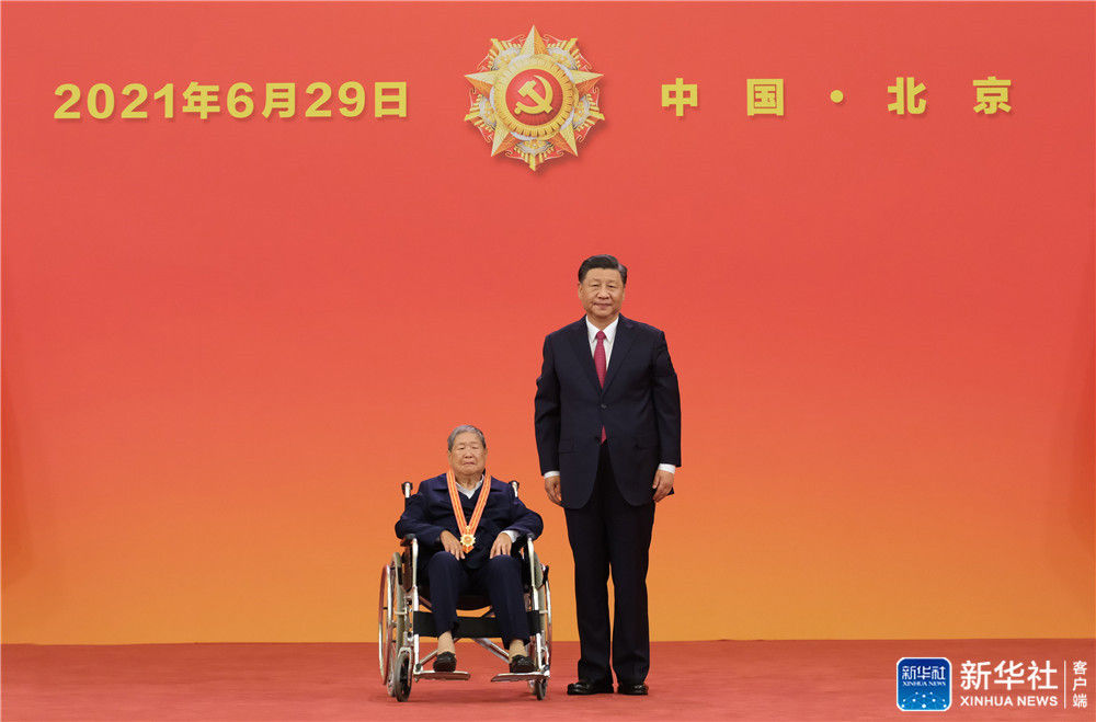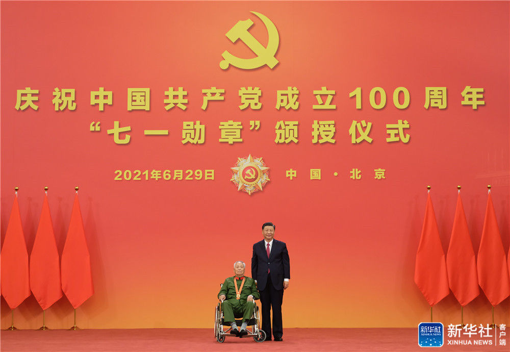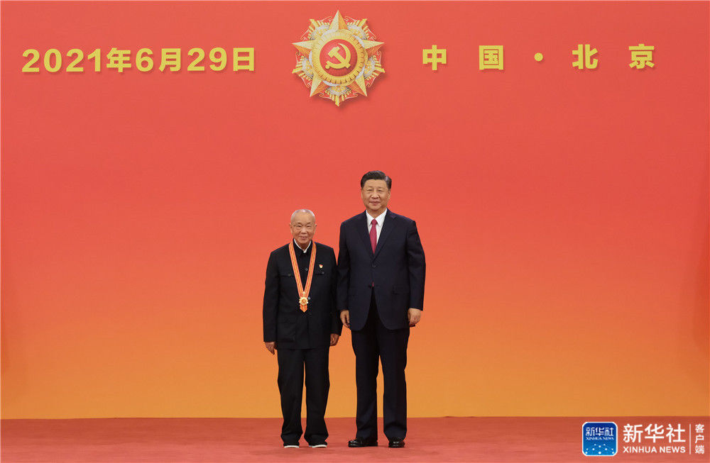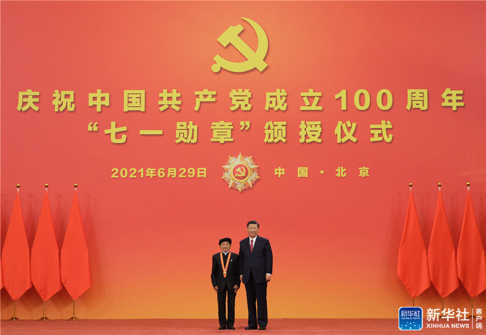 6月29日,庆祝中国共产党成立100周年“七一勋章”颁授仪式在北京人民大会堂金色大厅隆重举行。中共中央总书记、国家主席、中央军委主席习近平向“七一勋章”获得者崔道植颁授勋章。新华社记者 李学仁 摄