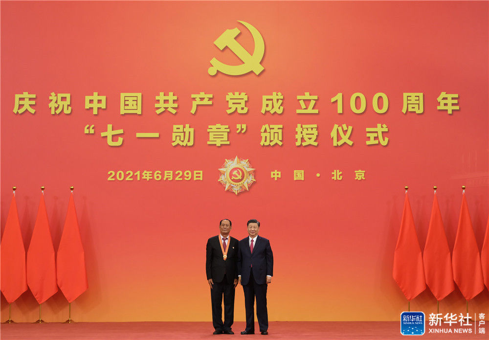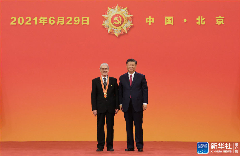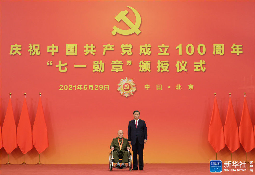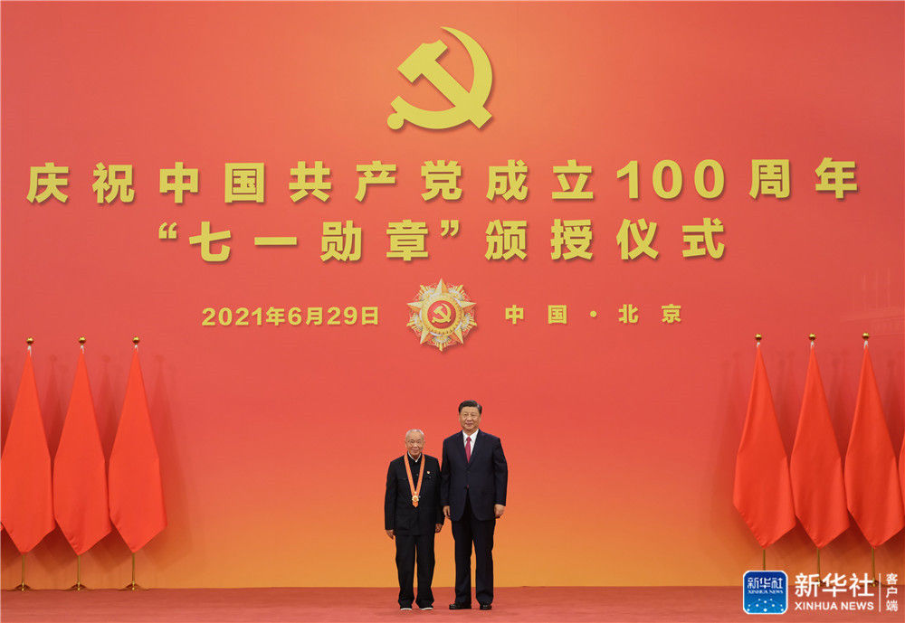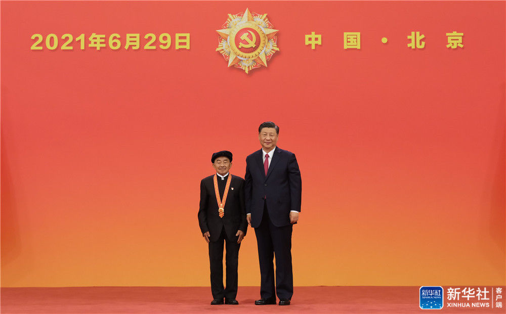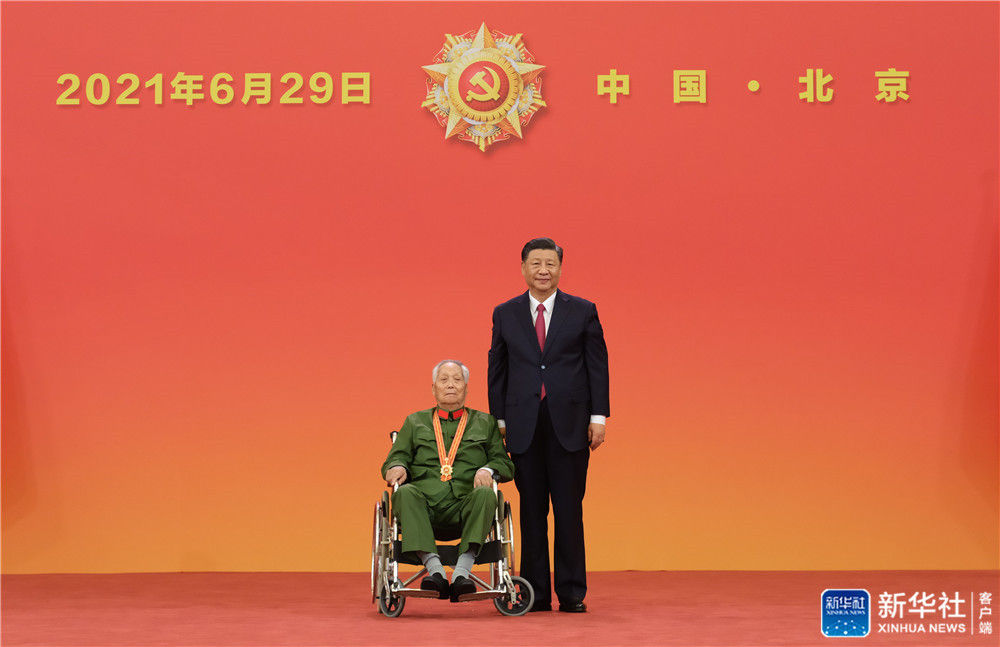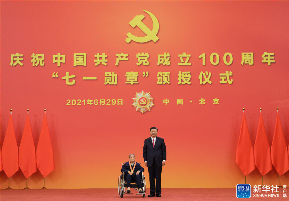 6月29日,庆祝中国共产党成立100周年“七一勋章”颁授仪式在北京人民大会堂金色大厅隆重举行。中共中央总书记、国家主席、中央军委主席习近平向“七一勋章”获得者崔道植颁授勋章。新华社记者 李学仁 摄