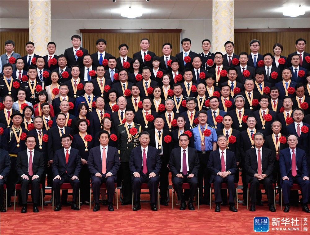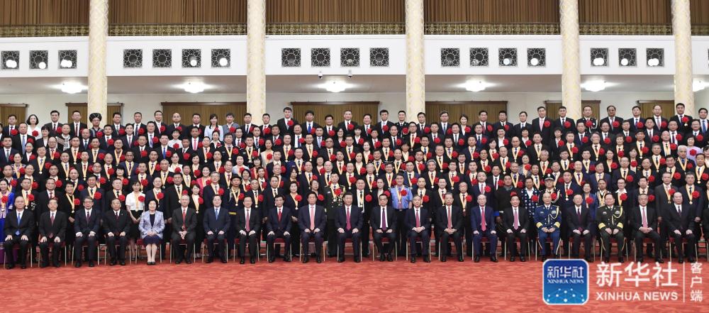 6月29日,庆祝中国共产党成立100周年“七一勋章”颁授仪式在北京人民大会堂金色大厅隆重举行。习近平等领导同志同“七一勋章”获得者合影。新华社记者 谢环驰 摄
