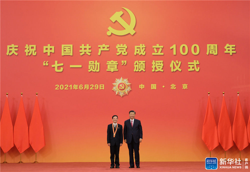 6月29日,庆祝中国共产党成立100周年“七一勋章”颁授仪式在北京人民大会堂金色大厅隆重举行。中共中央总书记、国家主席、中央军委主席习近平向“七一勋章”获得者刘贵今颁授勋章。新华社记者 李学仁 摄