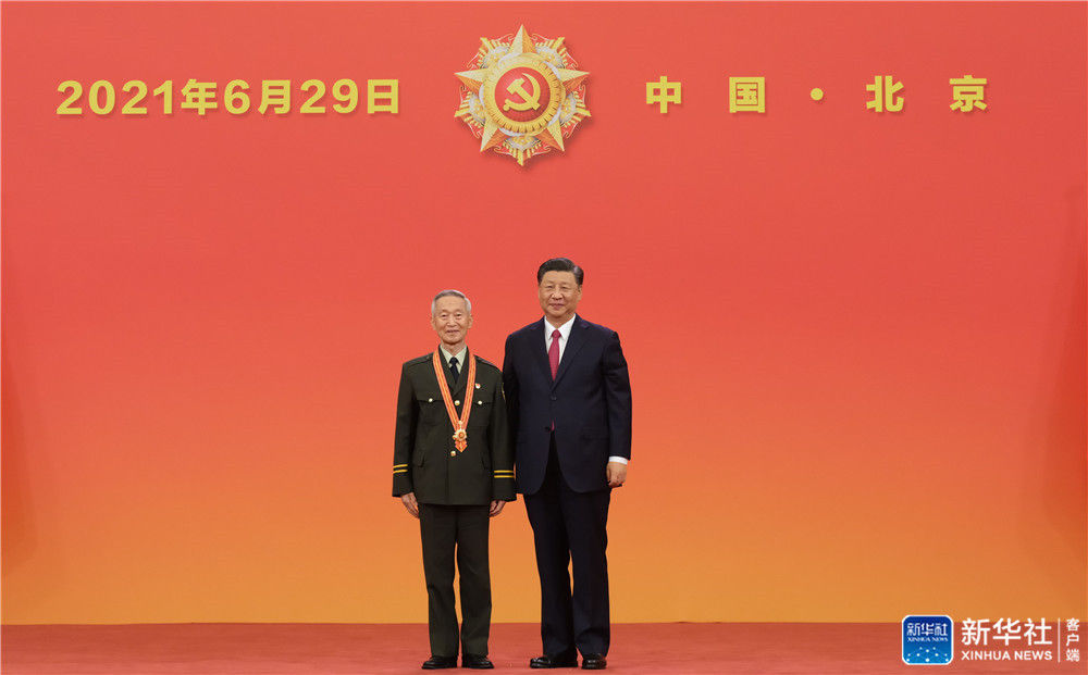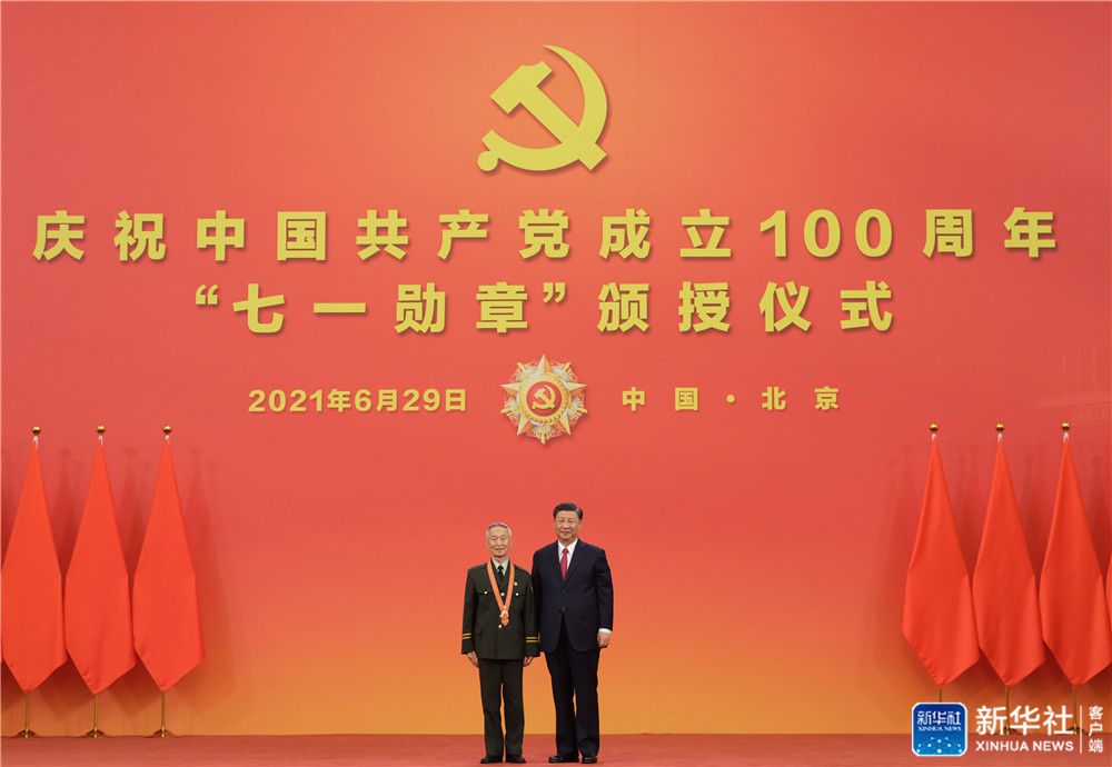 6月29日,庆祝中国共产党成立100周年“七一勋章”颁授仪式在北京人民大会堂金色大厅隆重举行。中共中央总书记、国家主席、中央军委主席习近平向“七一勋章”获得者李宏塔颁授勋章。新华社记者 李学仁 摄