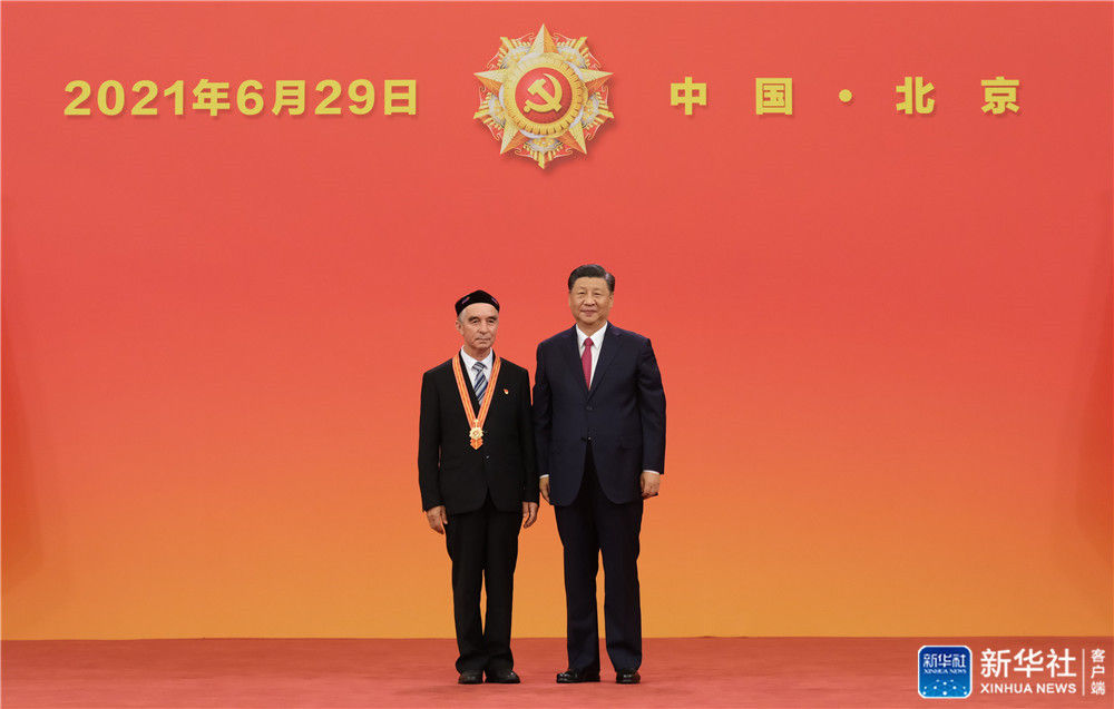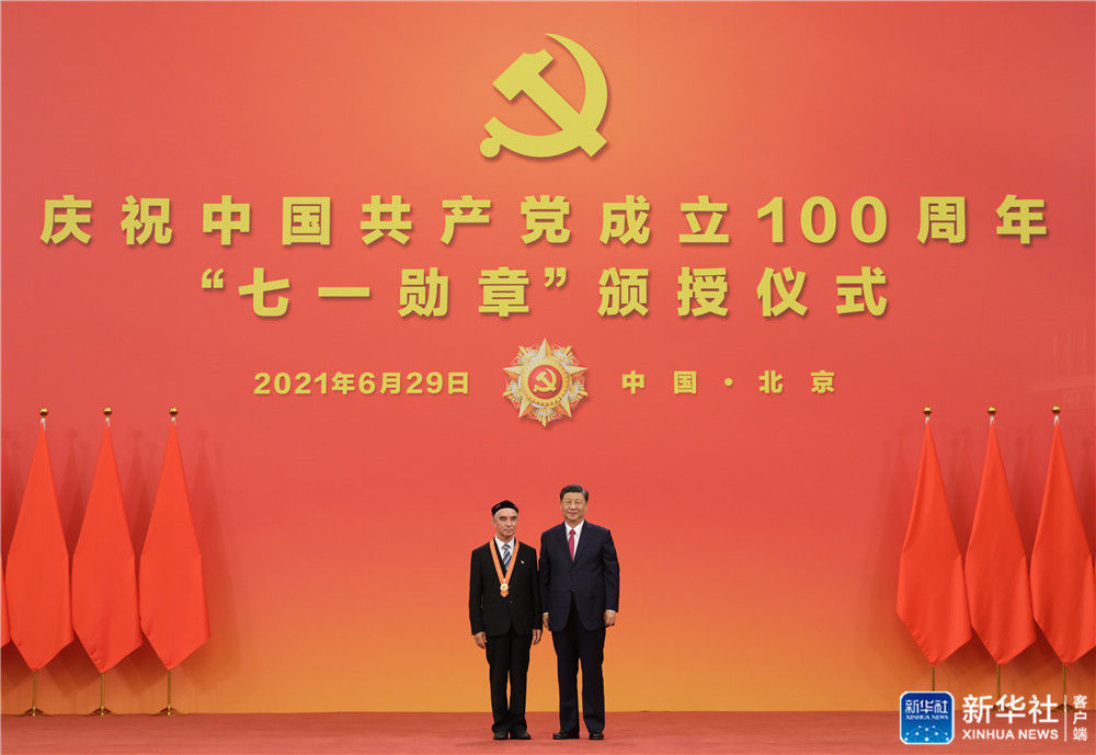 6月29日,庆祝中国共产党成立100周年“七一勋章”颁授仪式在北京人民大会堂金色大厅隆重举行。中共中央总书记、国家主席、中央军委主席习近平向“七一勋章”获得者买买提江·吾买尔颁授勋章。新华社记者 李学仁 摄