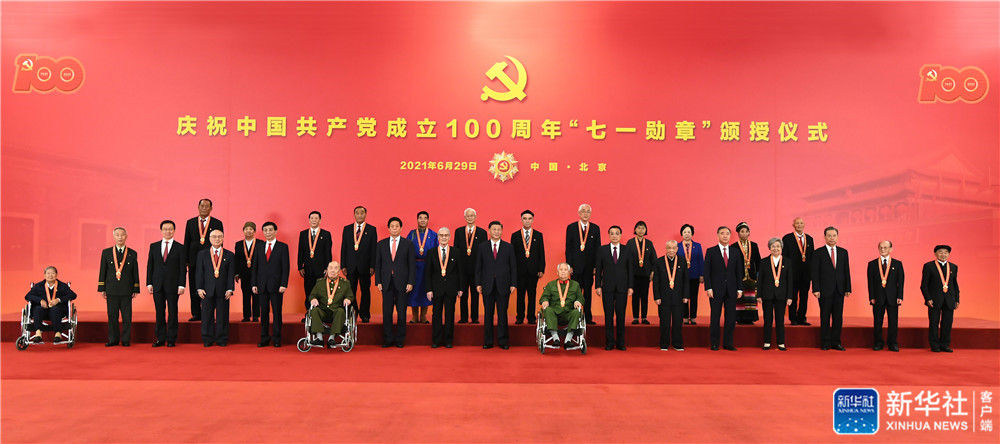 6月29日,庆祝中国共产党成立100周年“七一勋章”颁授仪式在北京人民大会堂金色大厅隆重举行。中共中央总书记、国家主席、中央军委主席习近平向“七一勋章”获得者颁授勋章并发表重要讲话。新华社记者 丁林 摄