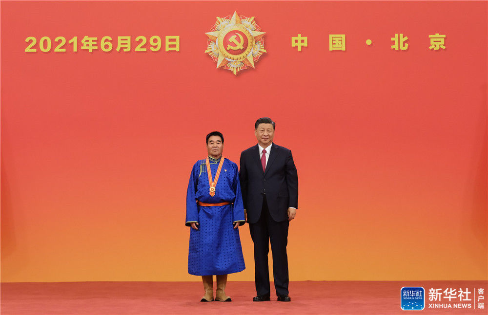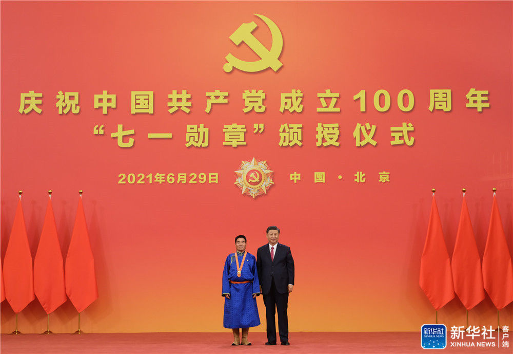 6月29日,庆祝中国共产党成立100周年“七一勋章”颁授仪式在北京人民大会堂金色大厅隆重举行。中共中央总书记、国家主席、中央军委主席习近平向“七一勋章”获得者廷·巴特尔颁授勋章。新华社记者 李学仁 摄