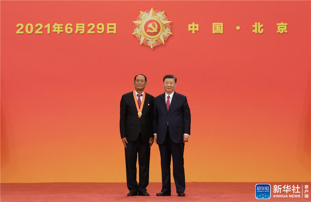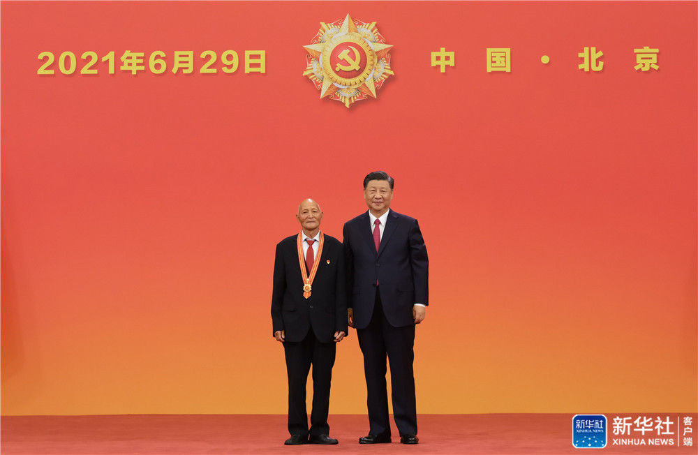 6月29日,庆祝中国共产党成立100周年“七一勋章”颁授仪式在北京人民大会堂金色大厅隆重举行。中共中央总书记、国家主席、中央军委主席习近平向“七一勋章”获得者黄大发颁授勋章。新华社记者 李学仁 摄