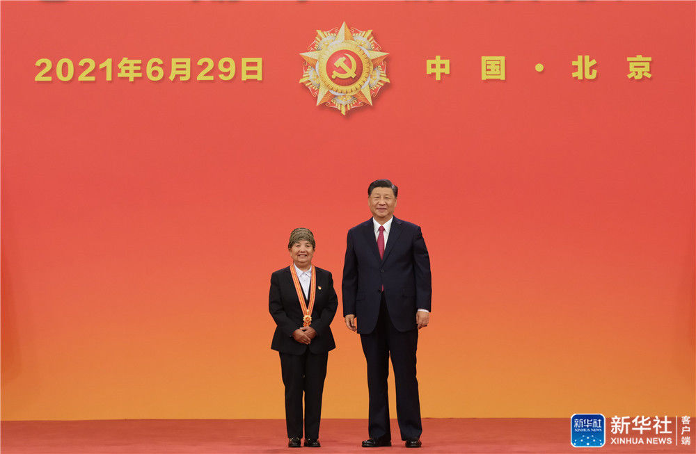 6月29日,庆祝中国共产党成立100周年“七一勋章”颁授仪式在北京人民大会堂金色大厅隆重举行。中共中央总书记、国家主席、中央军委主席习近平向“七一勋章”获得者卓嘎颁授勋章。新华社记者 李学仁 摄