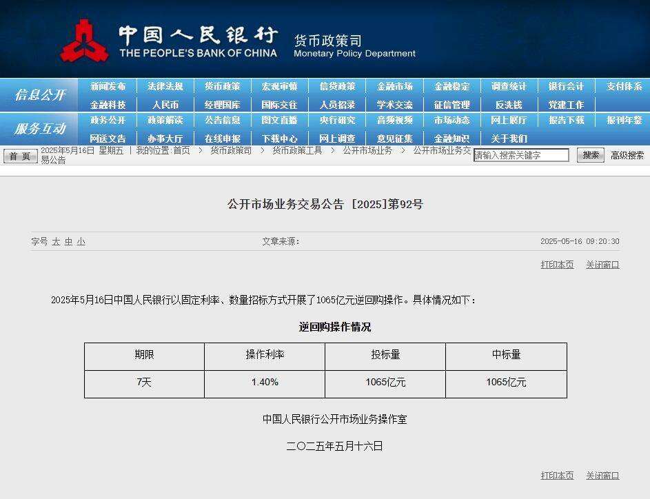 据中国人民银行官网消息,2025年5月16日中国人民银行以固定利率、数量招标方式开展了1065亿元逆回购操作。具体情况如下: