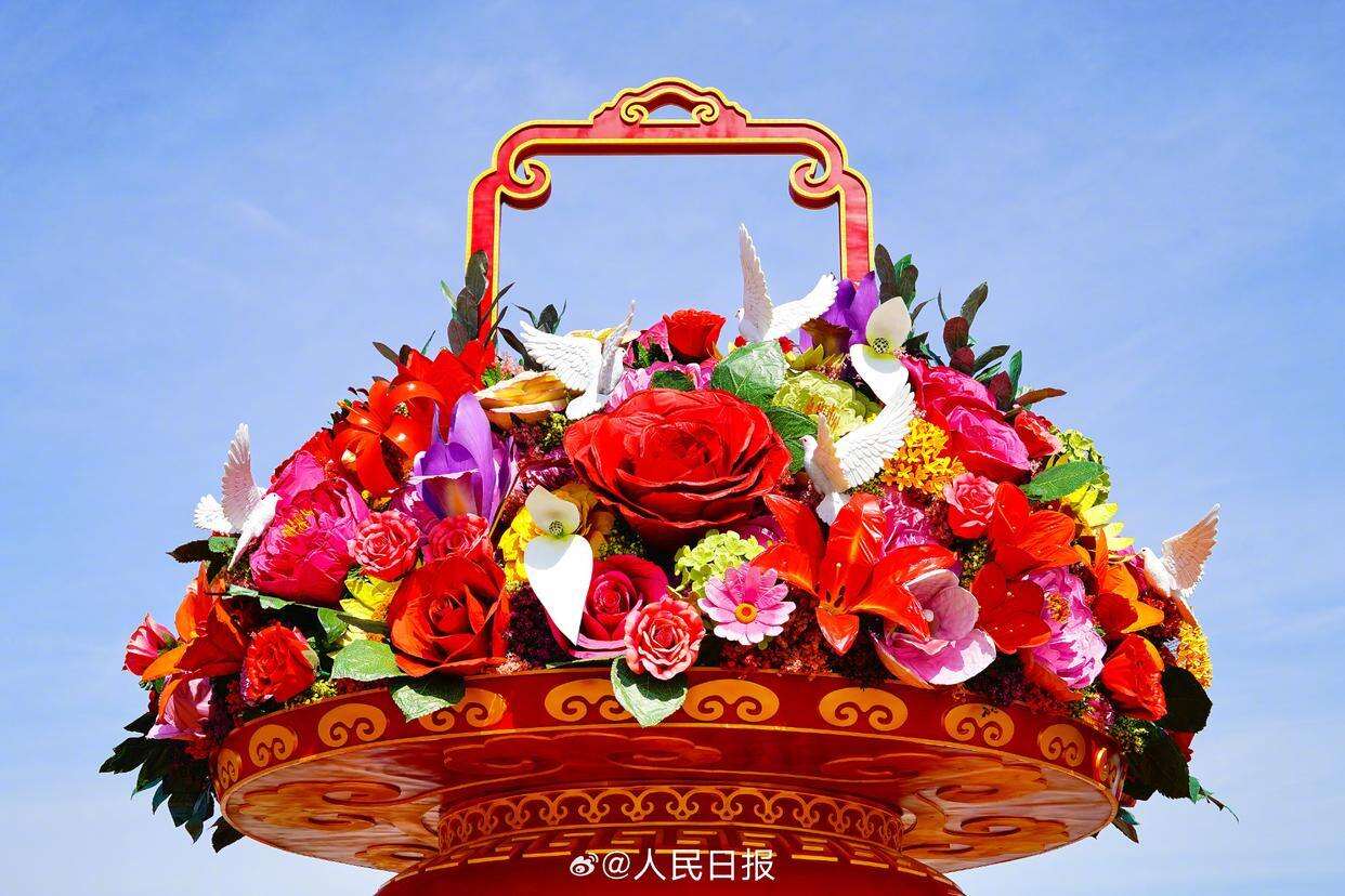 9月25日,2025年“祝福祖国”巨型花篮正式完工并亮相北京天安门广场。天安门广场中心“祝福祖国”花坛以喜庆的花篮为主景,花坛底部直径45米,为向日葵图案。花坛顶高18米,篮体高16米,篮盘直径12米。篮内选取了寓意美好的花卉,结合和平鸽元素,体现“和平发展、欣欣向荣”。