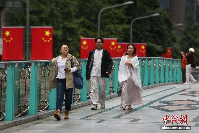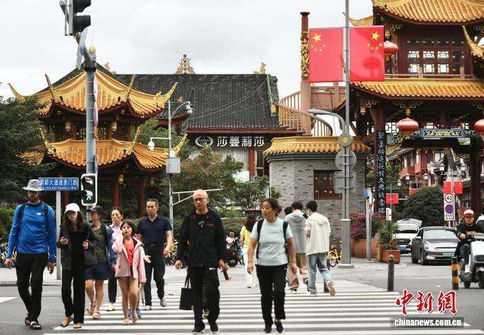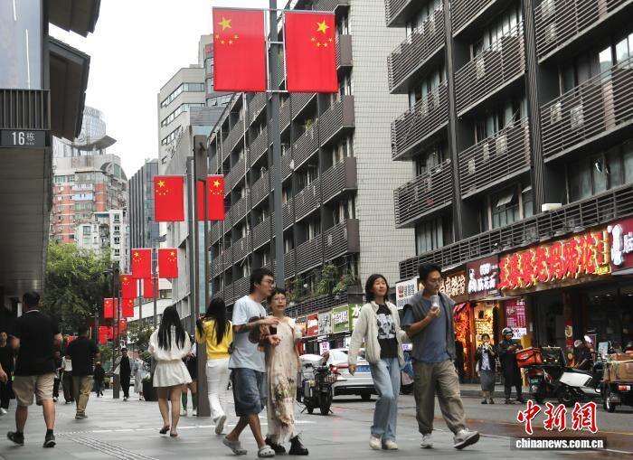 9月28日,国庆节临近,四川省成都市街头悬挂五星红旗,节日氛围渐浓。图为市民走在春熙路街头。中新社记者 王磊 摄