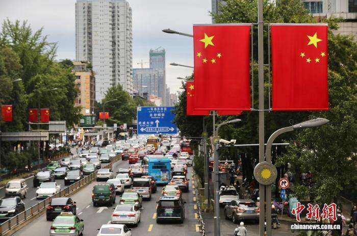 9月28日,国庆节临近,四川省成都市街头悬挂五星红旗,节日氛围渐浓。中新社记者 王磊 摄
