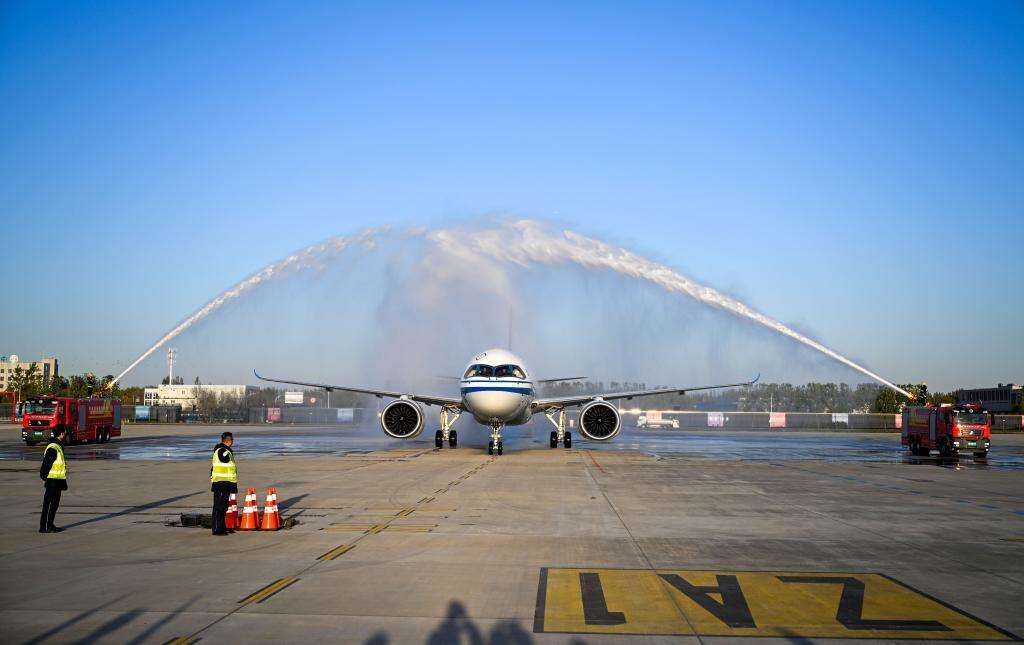 11月9日,国航C919重飞“两航起义”航线主题航班从香港飞抵天津,重温76年前“两航起义”的北飞航程,致敬“两航起义”爱国壮举。