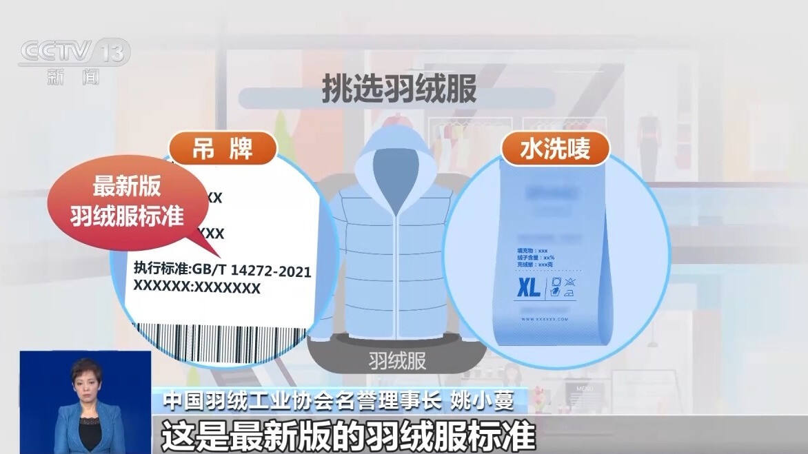 中国羽绒工业协会名誉理事长 姚小蔓:消费者在挑选羽绒制品时,有两个重要的点。首先,GB/T 14272—2021是最新版的羽绒服标准。另外,要看填充物是鸭绒还是鹅绒、绒子含量多少,这些都是正规厂家必须标注的内容。