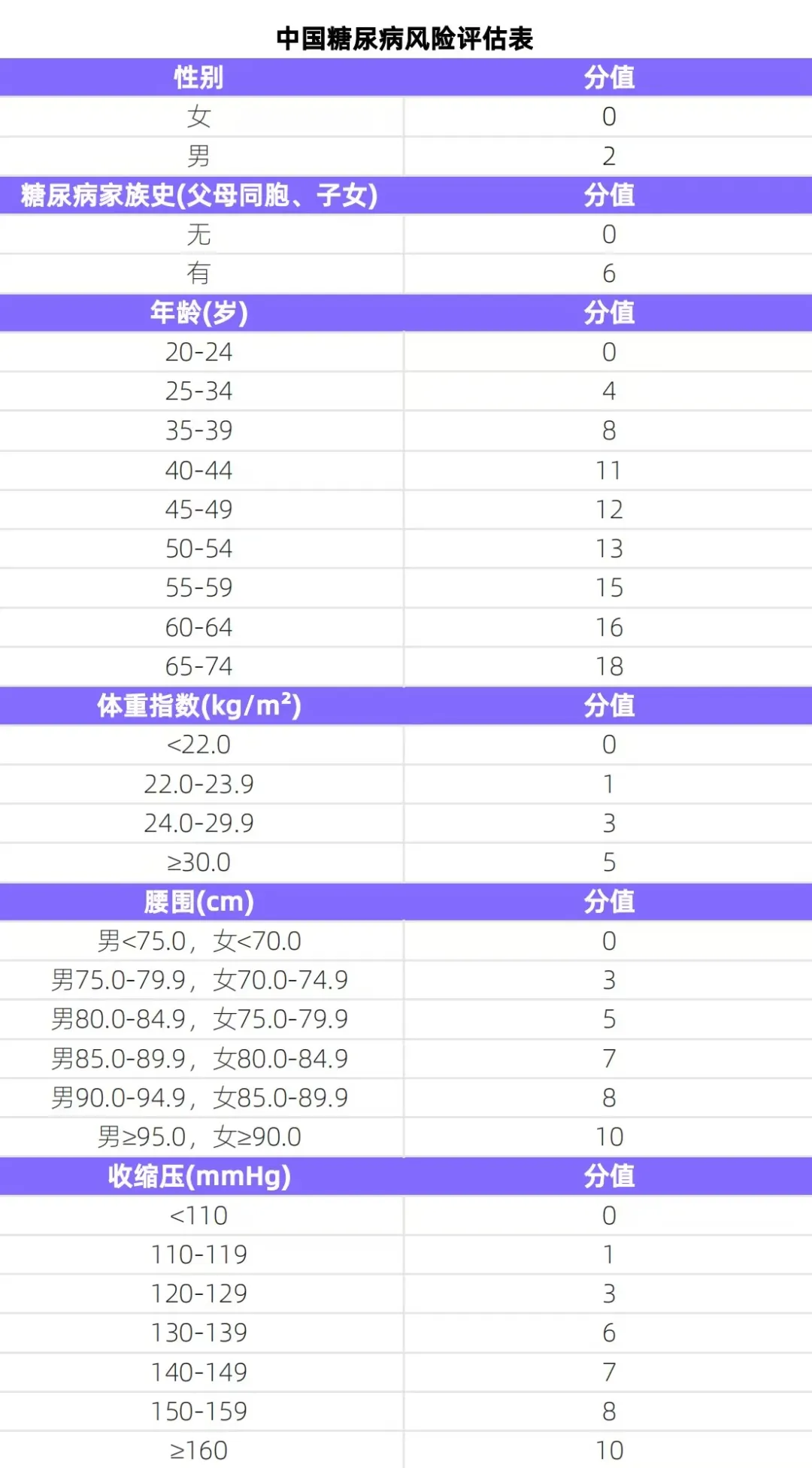 没过35岁的人,也可以参照《中国糖尿病风险评分表》:若你的评分相加≥25分,请重视自己的血糖检测。