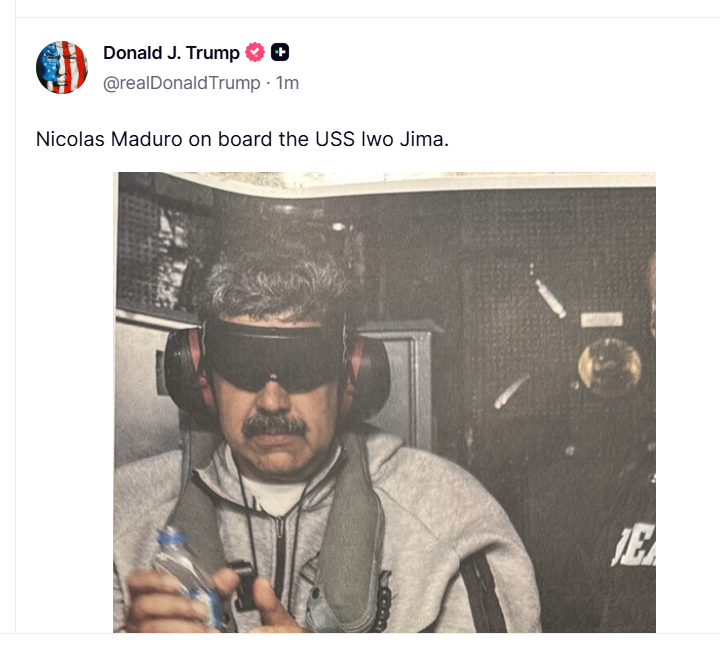 △记者会前,特朗普在社交媒体发布马杜罗在美军舰上戴手铐、双眼被蒙住的照片
