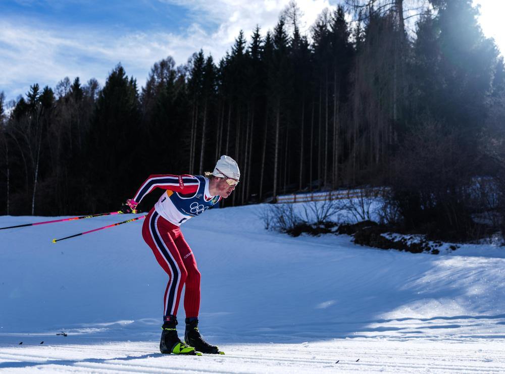 2月8日,冠军挪威选手克莱博在比赛中。当地时间2月8日,米兰-科尔蒂纳冬奥会越野滑雪男子双追逐比赛在意大利泰塞罗举行。新华社记者 彭子洋 摄