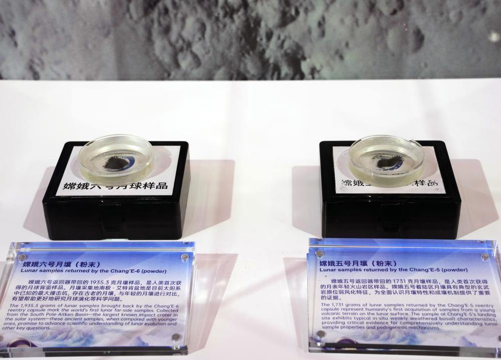2025年11月5日在第八届进博会国家展中国馆拍摄的嫦娥五号月壤和嫦娥六号月壤。新华社记者 刘颖 摄