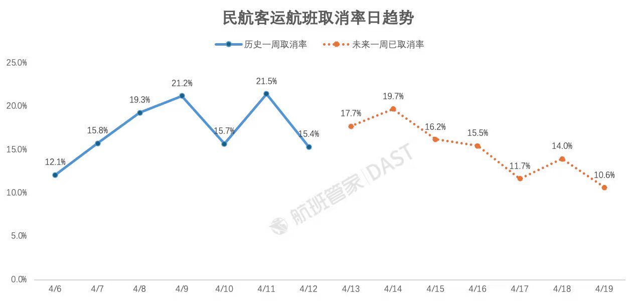 根据航班管家DAST数据显示,截至4月13日,未来七天民航客运航班量取消率达14.6%,不过仅为当前时间点计划取消,随着时间的推移,航班取消率仍会持续上升。