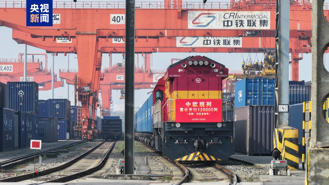 记者从中国国家铁路集团有限公司获悉,2025年11月28日12时13分,随着开往波兰马拉舍维奇的X8086次中欧班列从中国成都国际铁路港发车,中欧班列累计开行突破12万列,发送货值超4900亿美元。中欧班列高质量发展取得新成效,品牌价值得到全球认可。