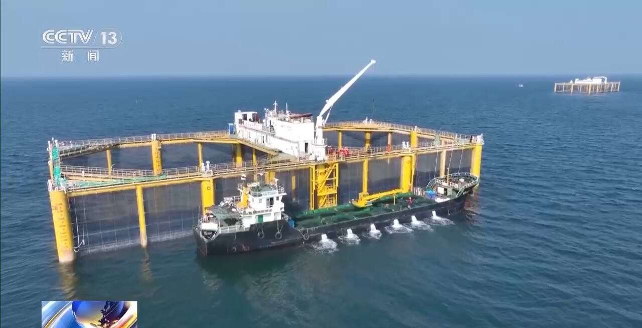 三文鱼在缓冲池生活7天后,会被送到海上网箱中,那里不仅环境更宽敞,还有智能设备监测生长情况,确保它们能健健康康,长成成鱼。
