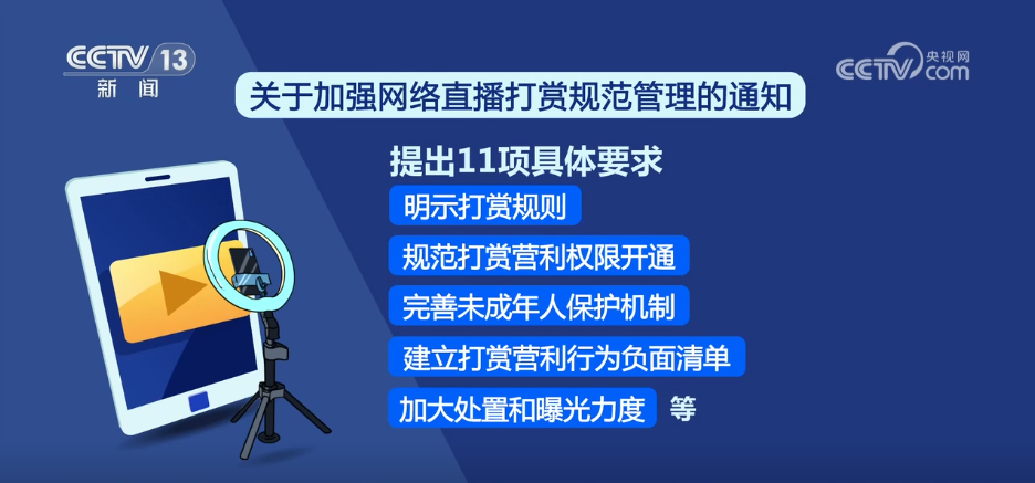 据记者了解,《通知》中提出11项具体要求,包括明示打赏规则、规范打赏营利权限开通、完善未成年人保护机制、建立打赏营利行为负面清单、加大处置和曝光力度等。