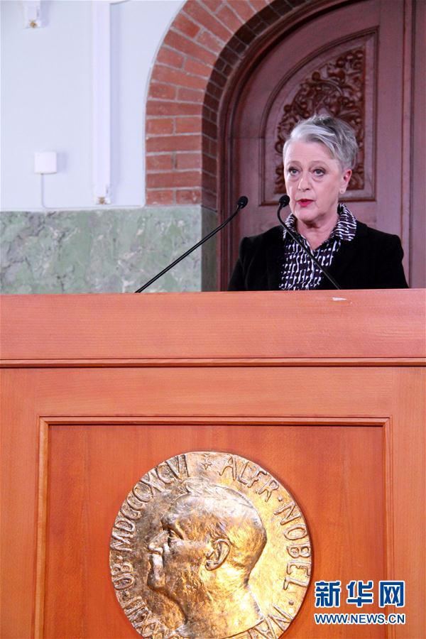 10月6日,在挪威首都奥斯陆,挪威诺贝尔委员会主席贝丽特·赖斯-安德森宣读授奖声明。
