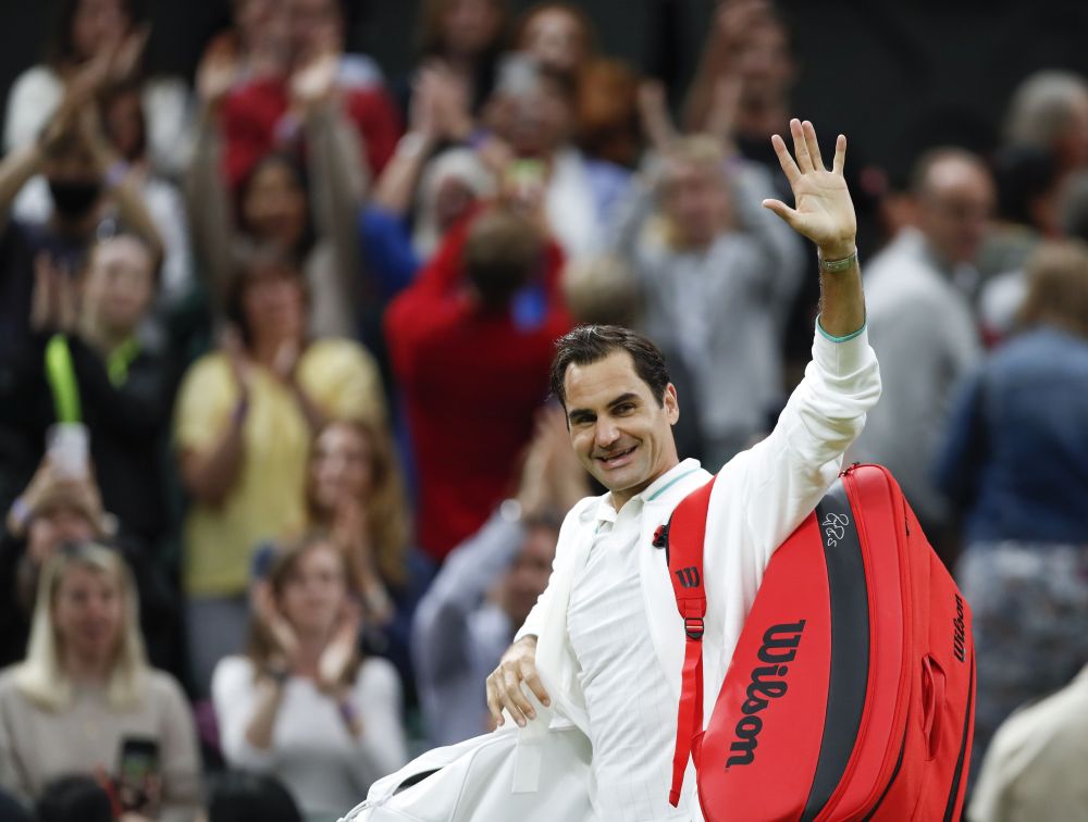 图为2021年7月5日,费德勒在温布尔登网球公开赛男子单打八分之一决赛后向观众致意。新华社记者韩岩摄