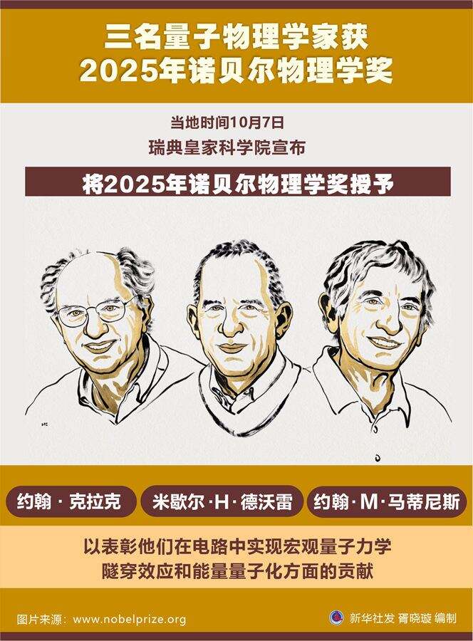在量子力学诞生百年之际,瑞典皇家科学院7日宣布,将2025年诺贝尔物理学奖授予约翰·克拉克、米歇尔·H·德沃雷和约翰·M·马蒂尼斯三名量子物理学家,以表彰他们在电路中实现宏观量子力学隧穿效应和能量量子化方面的贡献。