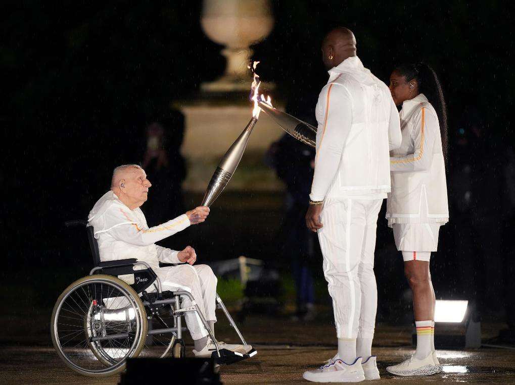 2024年7月26日,前法国女子田径运动员玛丽-若泽·佩雷克(右)、法国男子柔道运动员特迪·里内(中)与前法国男子自行车运动员夏尔·科斯特进行火炬交接。新华社记者杜宇摄