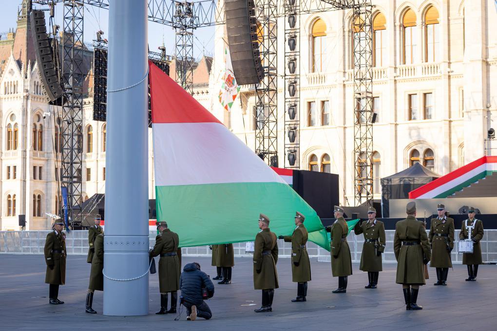 这是3月15日在匈牙利布达佩斯国会大厦前的科苏特广场拍摄的民族节升旗仪式现场。新华社发(鲍拉日·塞凯伊希迪摄)